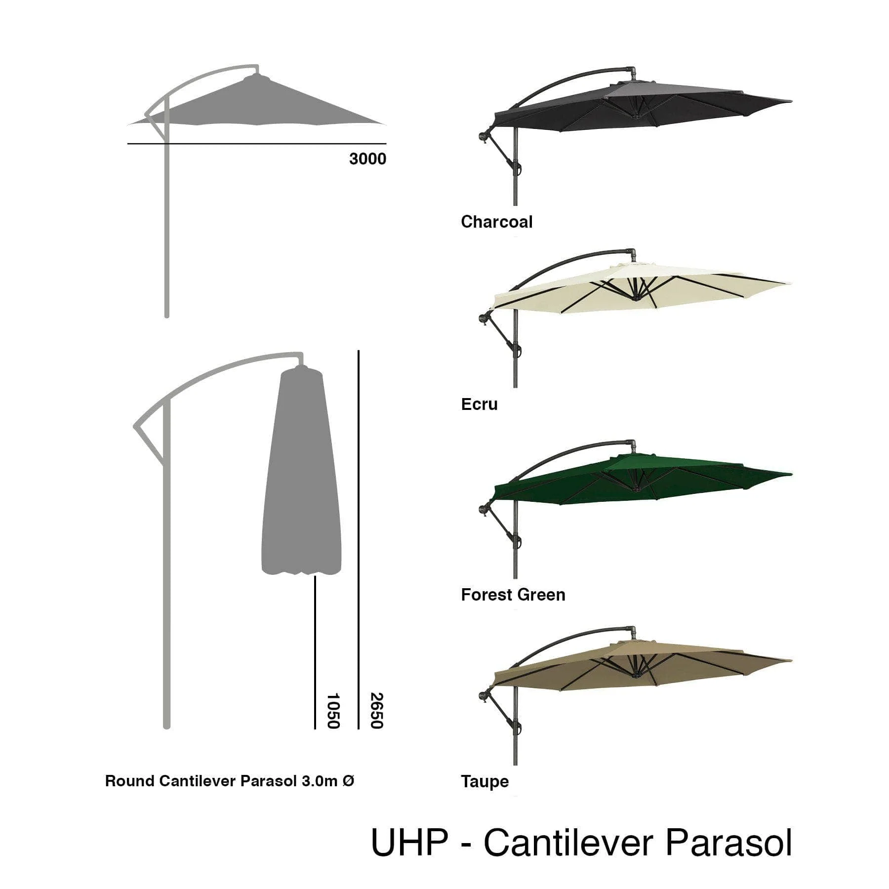 Alexander Rose Round Aluminium Cantilever Parasol 3m Diameter UHP - Taupe, Ecru, Forest Green, Charcoal