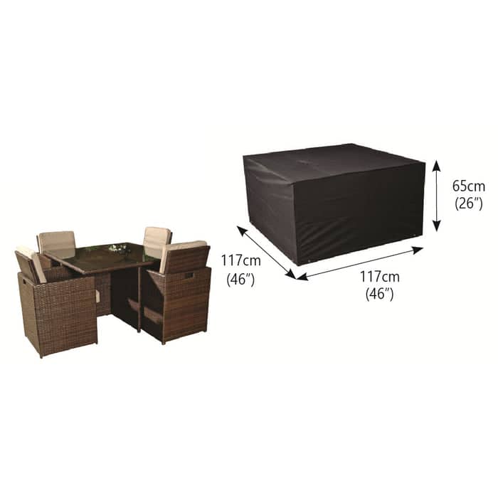 Keep your 4 seat cube set protected with this high quality cover complete with five year warranty, offers secure all weather protection due to its heavy gauge durable polyester fabric. This material has been UV stabilised so it will be more resistant to fading in the sun. Bosmere are one of the leading manufacturers of excellent garden furniture covers.Â