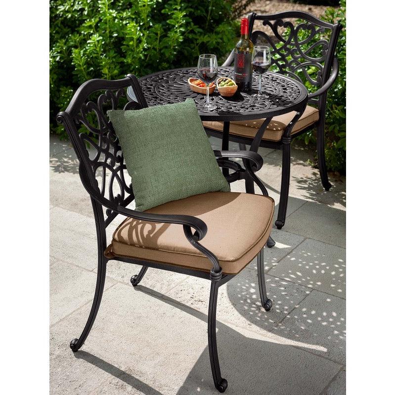Perfect for your balcony or patio, with this Capri bistro set summer just got even better. You'll find excuses every day to sit, dine, relax at this elegant table set. With romantic, classic curves, a smooth finish and our Weatherready® cushions you can use all summer. This quality cast aluminium furniture can be left outside in all seasons and still look beautiful in years to come. This set coordinates perfectly with other dining and lounging options in the full Capri collection.