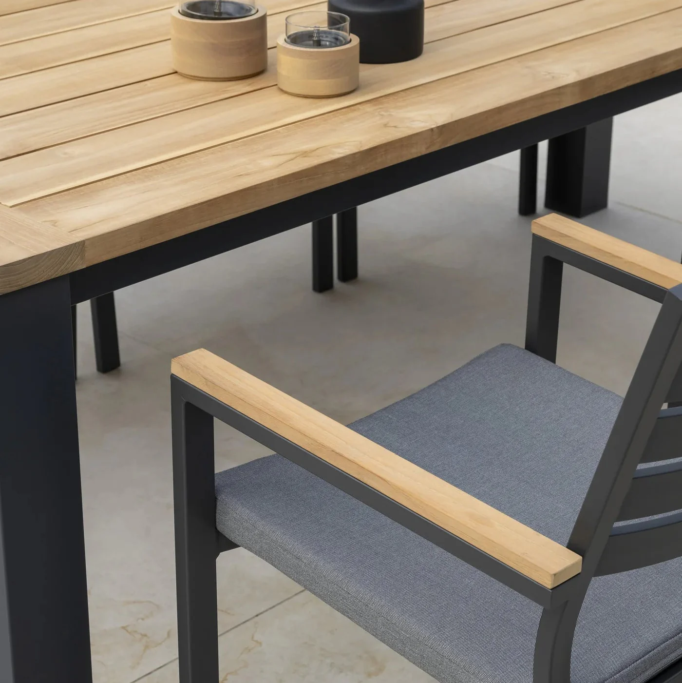 The Elba 6-Seater Dining Set is where sleek, contemporary design meets practical outdoor living. Featuring a durable aluminium frame, FSC-certified teak accents, and weatherproof materials, this set is built to last. The stackable dining chairs offer comfort with soft seat pads, while the spacious 220 x 100cm table is perfect for hosting alfresco meals.
